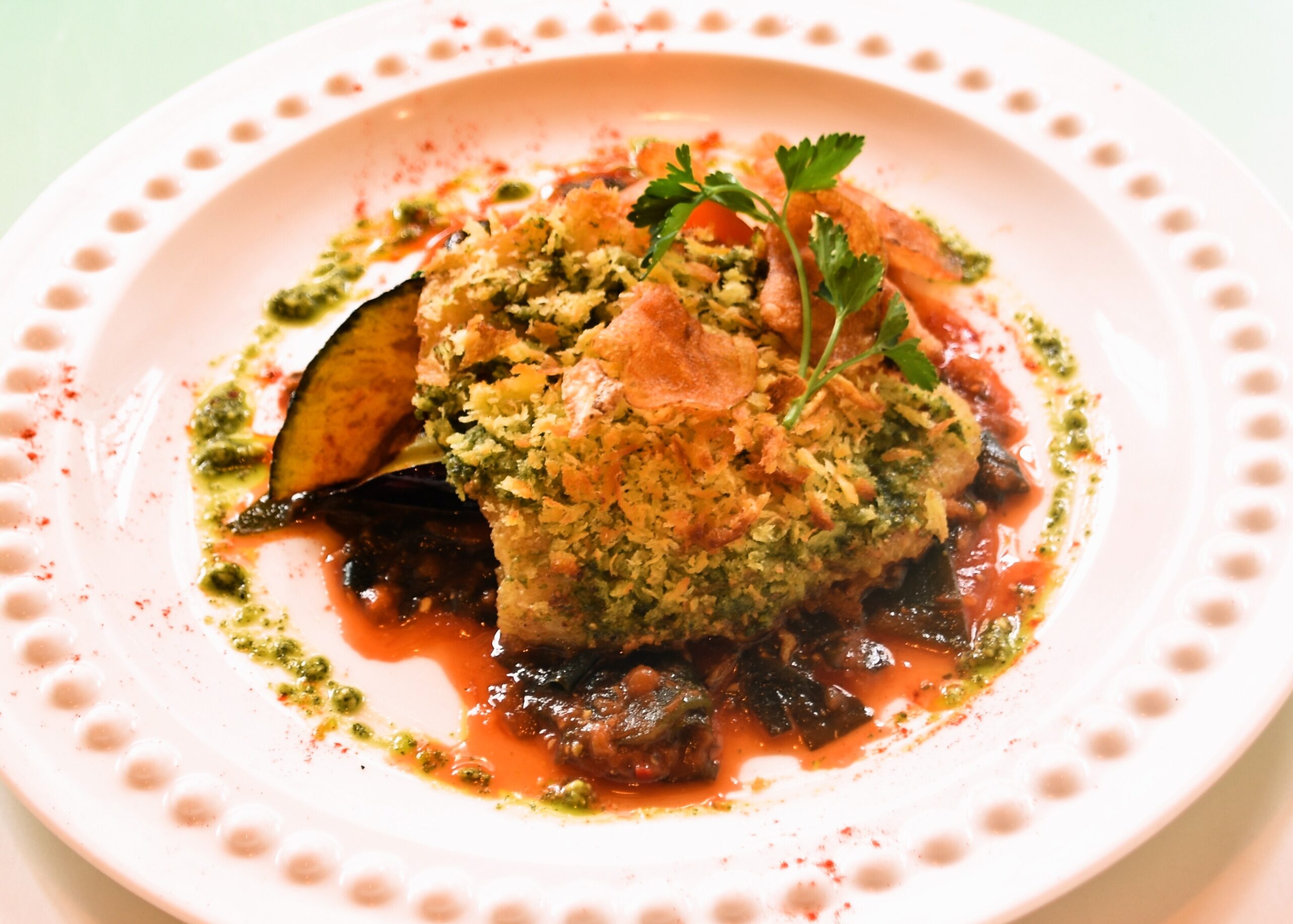 椎茸風味でパン粉焼きにした白身魚に、舞阪産の
