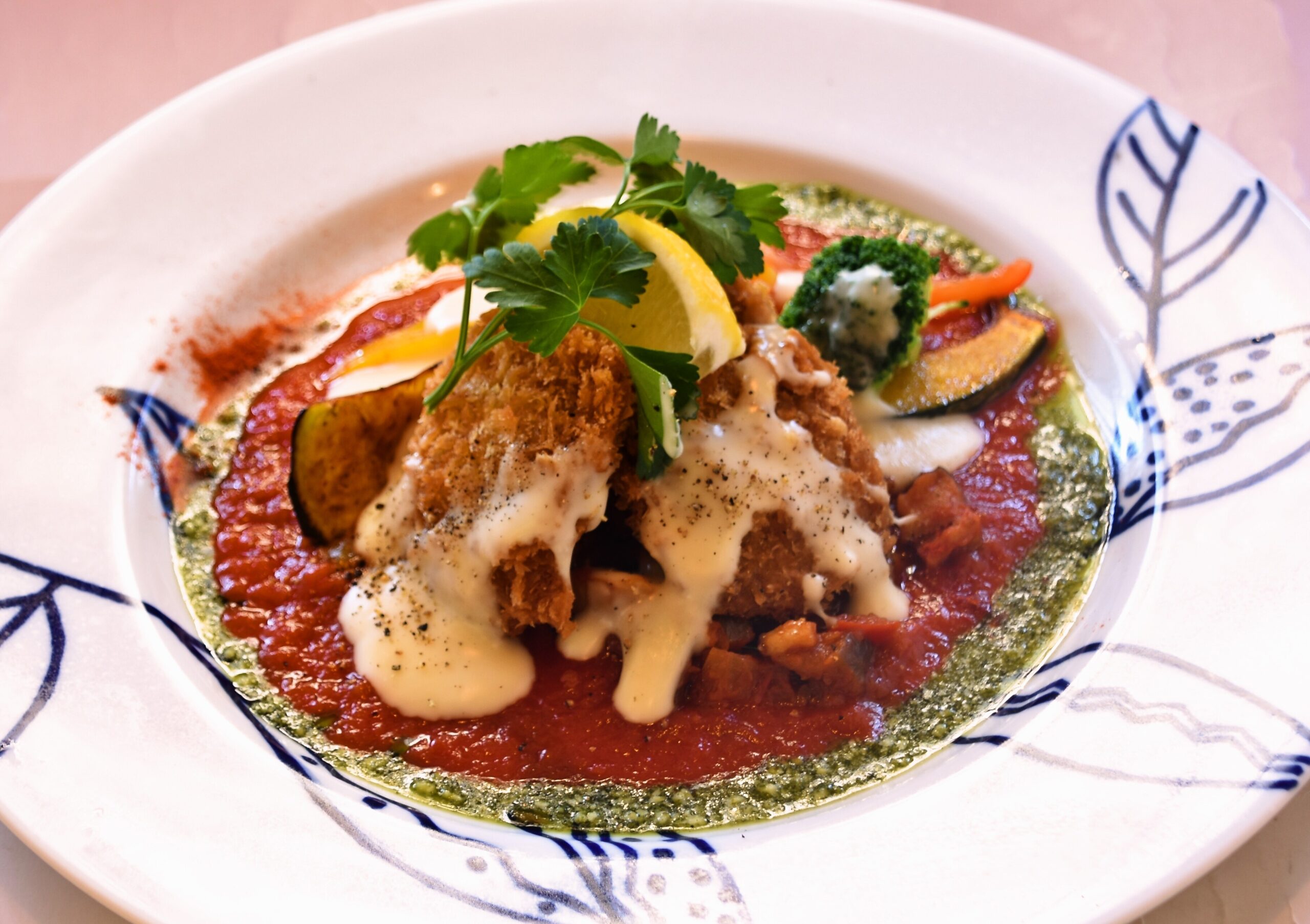 豚フィレカツにトマト、バジルのソースを合わせ、